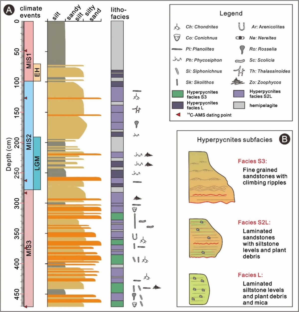 图2 S19站位沉积物重力柱的岩性组成、沉积相垂向分布及异重流沉积中的古生物遗迹种属特征