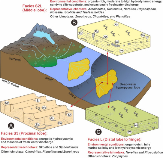 由于深海异重流起源于洪水期河口,其携带丰富的淡水和有机质以及运输过程的水动力变化将对输运路径上的生态环境产生明显影响。研究认为,近端相的深海异重流沉积(S3相)以强水动力和富含淡水为特征,导致生物遗迹不发育,仅有少量的垂直潜穴遗迹;在异重流中扇位置(S2L相),水动力有所减弱,大量有机质开始沉积,由于输运过程中混入了大量的海水,其盐度与周围海水相近,该沉积环境使得古生物遗迹种属较为丰富,垂直潜穴和水平潜穴均有发育;到了异重流沉积边缘相(L相),水动力基本较弱,大量有机质沉积使得该沉积相以机会主义的沉积物滤食型生物遗迹为主(图4)。本次研究识别出的深海异重流沉积古生物遗迹种属组合与前人报道的基本一致,该古生物遗迹种属组合模式有望成为深海异重流沉积的判别标志之一。