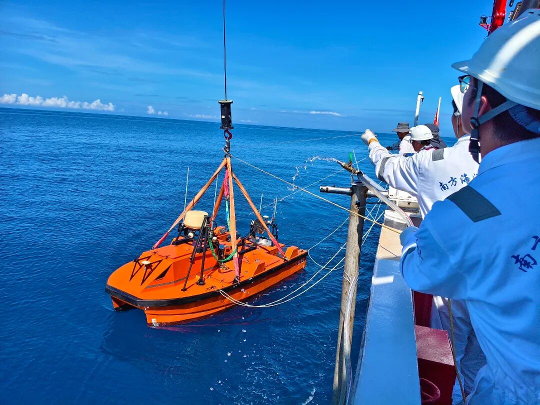 本航次聚焦台风对海洋环境的影响,构建起空、海、表、体一体化的立体观测网络:借助自动气象站和探空气球观测,捕捉大气边界层结构演变;利用走航ADCPFerryBox系统实现海流剖面连续测量及表层水温、盐度、化学要素的高分辨率监测;通过CTD剖面探测和多层次生化采水,解析海洋物理和生物化学环境的垂向特征。同步开展海面遥感对比观测,为卫星遥感数据的真实性检验提供支撑;运用VMP剖面仪进行湍流微观结构测量,揭示海洋能量传递过程。在南方海洋科学与工程广东省实验室(珠海)的大力支持下,航次成功实现无人船自动追踪探测锋面区域,展现了我国海洋观测技术的先进水平。