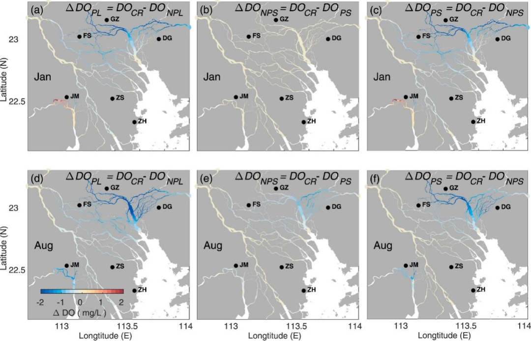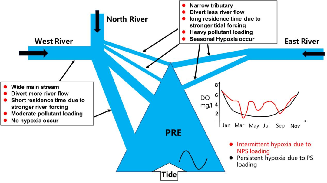 我院海洋环流与物质输运团队与省内环境、水利及海洋业务部门合作,利用珠江感潮河网的水质自动监测数据,对珠江感潮河网2022年的水质过程及低氧/缺氧事件时空变化规律进行统计分析,并通过河网-河口近海耦合的水动力-水质模型,对珠江河网广佛、东莞、狮子洋、潭江下游四个典型低氧/缺氧区进行溶解氧收支和数值实验分析。研究结果表明在剧烈的人类活动、水温季节变化及上游河流流量变化与下游潮汐的共同作用下,使得上述区域更容易在夏季发生低氧/缺氧事件,同时CBOD的氧化过程及氨氮的硝化作用主导了耗氧。数值实验的结果发现非点源污染负荷对东江下游低氧事件的贡献最为显著,使得低氧事件伴随降雨呈间隙性出现。