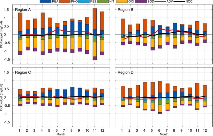 图1: 珠三角河网广佛区(Region A)东莞区(Region B)狮子洋区(Region C)和潭江区(Region D)2022年逐月溶解氧收支模式