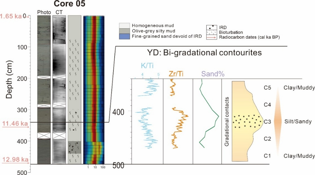 位于峡谷内部的岩芯37中,YD 层以细粒浊流沉积为主,沉积特征包括正粒序砂层、生物扰动改造的波状纹层及均质砂等,均不含冰筏碎屑(图2);位于峡谷外部陆坡的岩芯05则主要受到底流作用的影响, YD层砂含量、地化元素比值的变化趋势和渐变式接触均符合典型双粒序底流沉积特征(图3)。