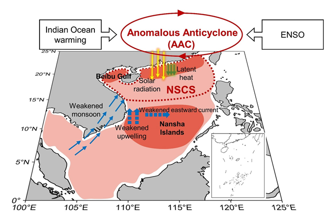 近年来,南海海洋热浪这一极端暖事件正变得更频繁、更持久,其中南海北部和南沙群岛是热点区域。海洋热浪的形成与西北太平洋异常反气旋系统直接相关,其导致的风速减弱和太阳辐射增强是主因,海洋动力过程在边界流区更重要(图3)。未来气候增暖背景下,南海海洋热浪将持续呈现出频率增加,强度增强的趋势。长期的海洋增温和极端热浪事件已对南海生态系统构成严重威胁,导致鱼类北迁、珊瑚礁白化死亡,深刻改变了海洋生物多样性与生态系统平衡。