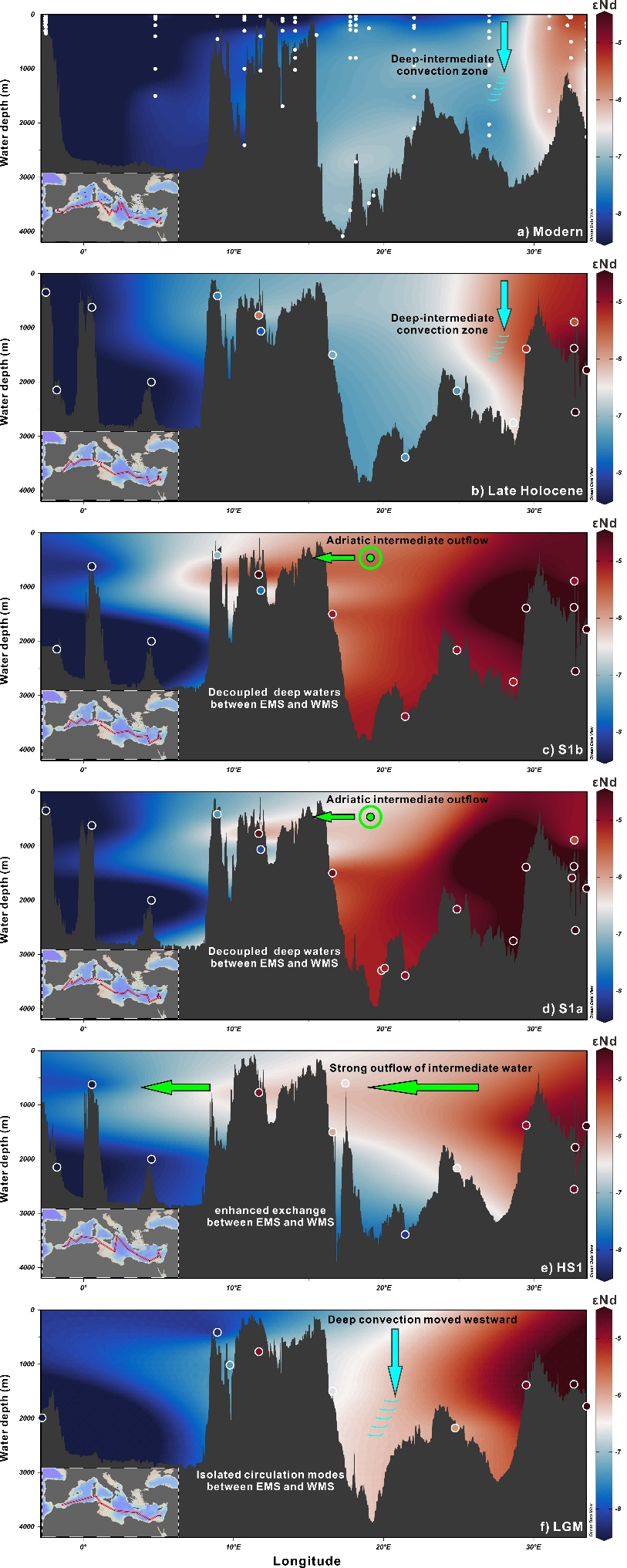 地中海因半封闭海盆特性及较短的环流混合时间(75–150年),其温盐环流对气候变化高度敏感并且快速响应:近70余年西地中海深层水变暖记录以及上世纪90年代观测到东地中海深层水形成位置改变均为明证。地中海环流变化可影响甚至改变大西洋经向翻转流(AMOC)的强度与模态,且与腐泥层(sapropel)形成直接相关。腐泥层是富含有机质的页岩沉积,可通过海洋沉积物或海相地层追溯到中中新世(更多出现在东地中海),其沉积呈现特征天文韵律,只形成于岁差极小值期,对应北半球夏季太阳辐射量最大值及非洲季风活跃期。腐泥层形成通常指示了底层水体缺氧,这与深层通风减弱和表层生产力增强有关。这些过程背后的主要驱动因素是表层水体的相对淡化。然而,在不同气候条件下,地中海环流对淡水强迫的响应敏感性仍不明确,尤其是在淡水来源、海平面及海盆差异等方面。