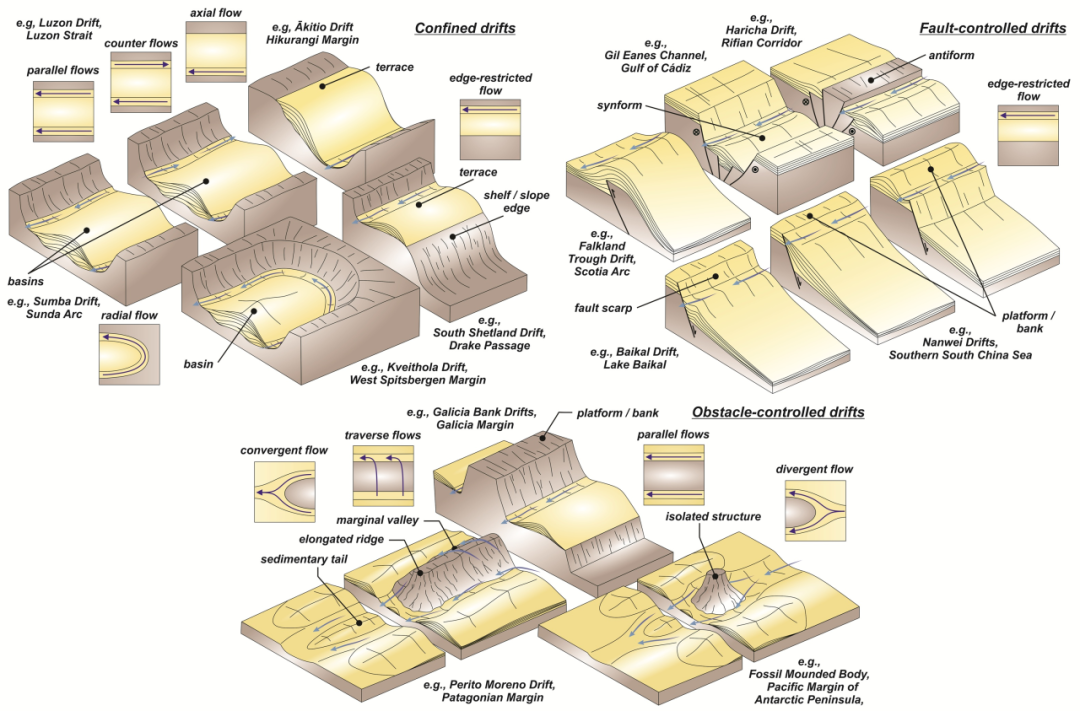 底流沉积体系在全球范围内呈现显著的构造相关性(图1)。本文总结了底流沉积体系的几何形态、内部反射特征与叠加方式,提出修订后的漂积体分类方案(图2)。通过构建漂积体形态与典型侵蚀标志的对应关联,将底流漂积体划分为限制型、断控型和障控型三类,并从构造背景、海底地形及底流动力的角度分析其演化差异(图3)。