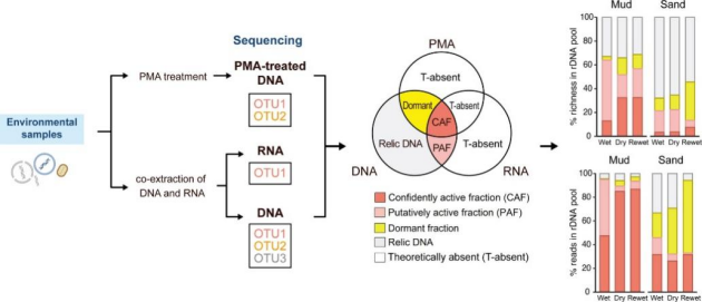 应用16s/18s rRNA基因高通量测序技术已极大增进了我们对不同生态系统中微生物多样性及其群落组成时空动态的认识。然而,这些基于环境样本总DNA的宏条纹码技术,所捕获的既包含活跃的也混杂着休眠及死亡的微生物身份信息。因此,基于环境DNA的测序高估了实际参与生物地球化学循环的活跃微生物的多样性与丰度。如何高效地区分环境样品中活跃、休眠与死亡类群仍是当前面临的重要挑战。