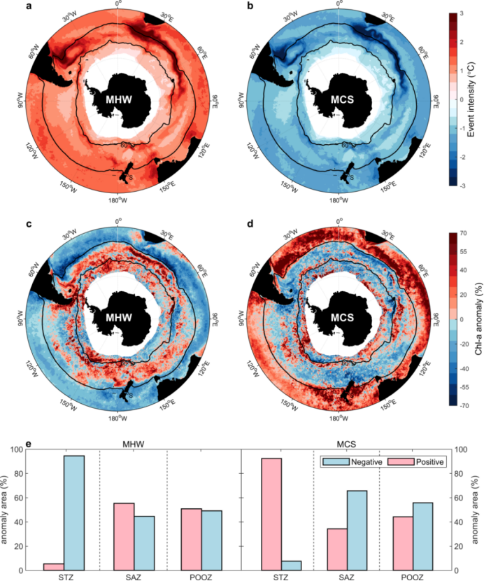 图1. (a, c) 海洋热浪期间的平均强度及叶绿素 a 异常百分比。(b, d) 海洋冷浪期间对应的指标。(e) 海洋热浪和冷浪期间,亚热带区、亚南极区和永久开阔海域中叶绿素a异常所占的面积比例。