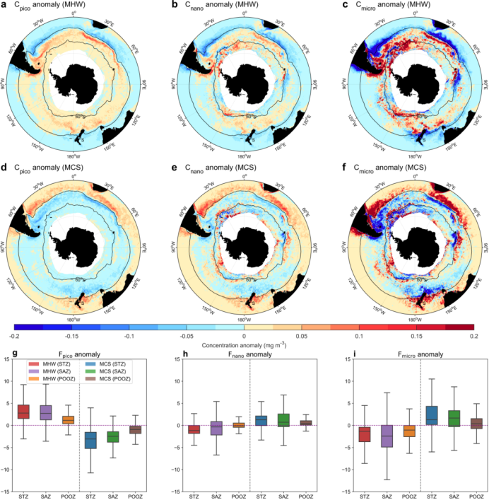 图2. (a–c) 海洋热浪期间,微微型浮游植物(a)、微型浮游植物(b)和小型级浮游植物(c)的叶绿素 a 异常。(d–f) 海洋冷浪期间各粒级浮游植物对应的叶绿素 a 异常。(g–i) 极端温度期间,子区域中浮游植物群落比例异常的箱线图。