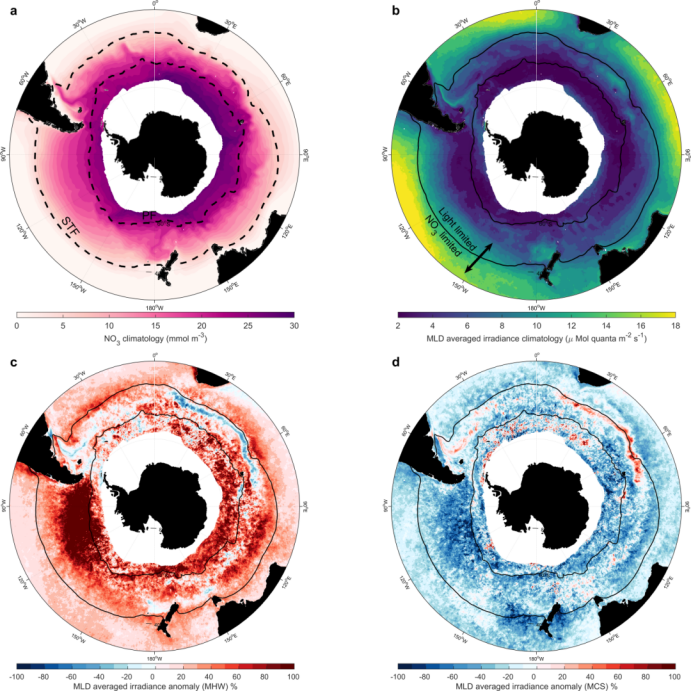 图3. (a, b)南大洋硝酸盐与混合层平均辐照度气候态,(c, d)混合层平均辐照度在海洋热浪和冷浪期间的平均异常百分比。