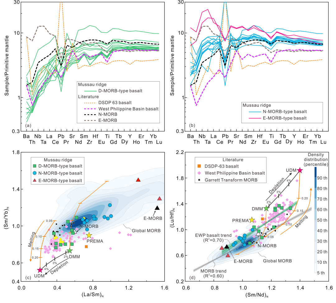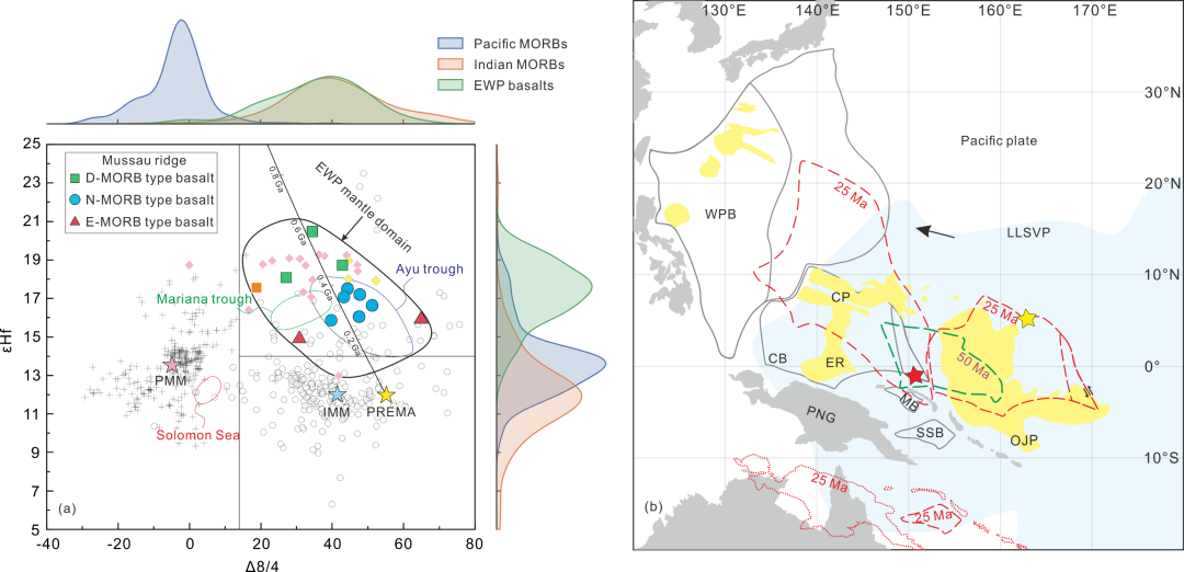 进一步与西菲律宾海盆、卡洛琳海盆等邻近海盆的MORB型样品对比发现,这种独特的超亏损的不相容元素组成、高Lu/Hf、εHf和Dupal 型 Pb 同位素特征并非穆绍地区局部现象,而是在赤道西太平洋多个边缘海盆(如马努斯海盆、西菲律宾海盆等)中具有一致性,指示该区域存在一个空间上可识别的超亏损、Dupal 型地幔域。该地幔域具有高的 εHf 和 Δ8/4,明显区别于传统太平洋 MORB 地幔和印度洋 MORB 地幔,表明太平洋上地幔并非以往认为的那样均一,而是保存了重要的区域性地球化学不均一性(图4a)。