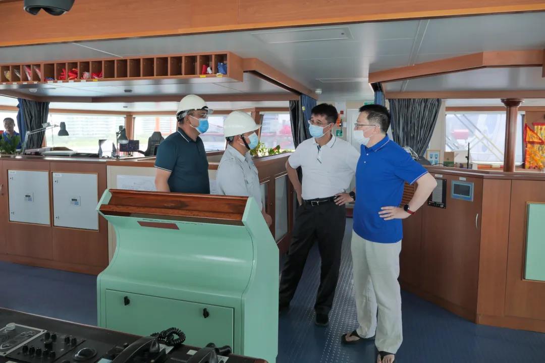 陈大可院士(右一)、邰忠智副校长(右二)与船长徐华(左二)交流