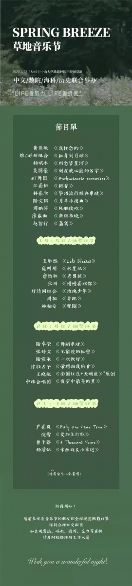 2022年4月23日,在南国春日之际, 中山大学珠海校区“Spring Breeze”草地音乐节如期而至。珠海校区的师生们在夜色中,相聚于田径场草地,奏响青春的乐章。