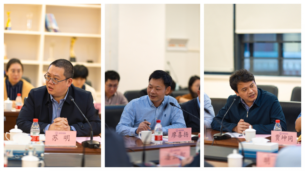 参加调研的学院领导班子其他成员和教师代表踊跃发言。副院长苏明教授介绍了学院“强基础、重实践、促融合”的人才培养模式。党委副书记廖喜扬重点汇报了学院深化“三全育人”、第一课堂与第二课堂融合的情况。学院党委委员、工会主席赵俊教授谈到基于“知识交叉+兴趣驱动”的大学生创新创业人才培养模式将有效地激发学生主动性和创造性。青年教师Tham Yee Jun(谭羽俊)副教授与林根妹副教授分享了青年教师的心得与体会,并感谢学校和学院为青年教师的成长与跨学科交流搭建了平台、提供了舞台。高松校长听取了汇报和发言,并和教师们讨论交流。