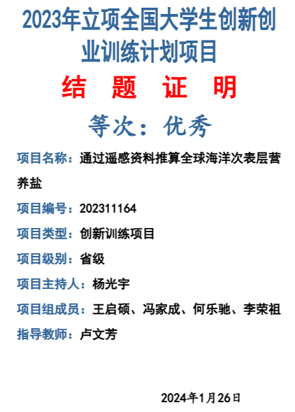 杨光宇等同学依托2023年省级大创项目“通过遥感资料推算全球海洋次表层营养盐”,开展物理海洋、海洋生态动力耦合和人工智能的多学科交叉研究,为海洋环境和生态学研究提供新的研究思路和技术手段,该研究工作还得到了国家自然科学基金项目的资助。此外,该大创团队于2023年10月13日至15日参加2023年海洋科技前沿国际会议(ICFOST),并做了口头报告(图2),同年12月份,在大学生创新创业训练项目的结题答辩评审中被评为“优秀”等级(图3)。