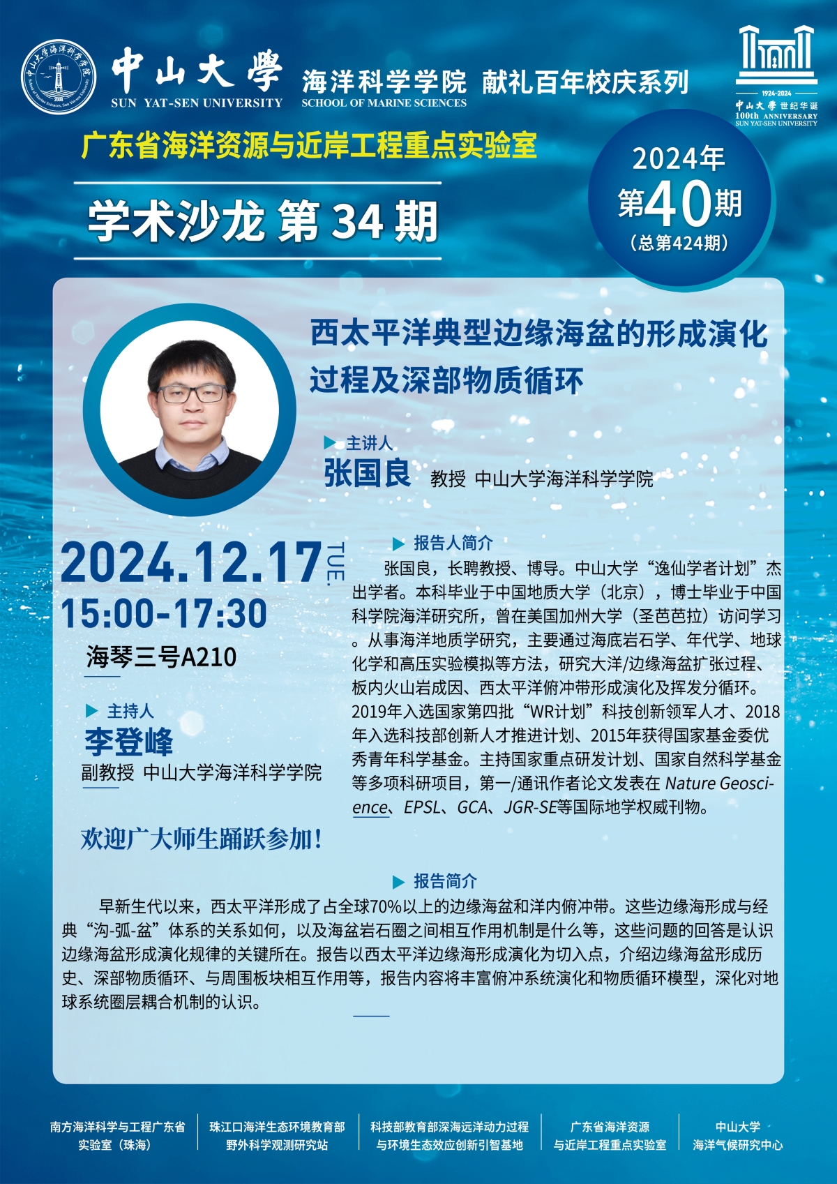 海洋科学学术讲座预告第424期:西太平洋典型边缘海盆的形成演化过程及深部物质循环