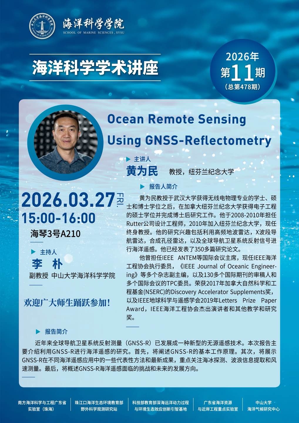 海洋科学学术讲座预告第478期:Ocean Remote Sensing Using GNSS-Reflectometry