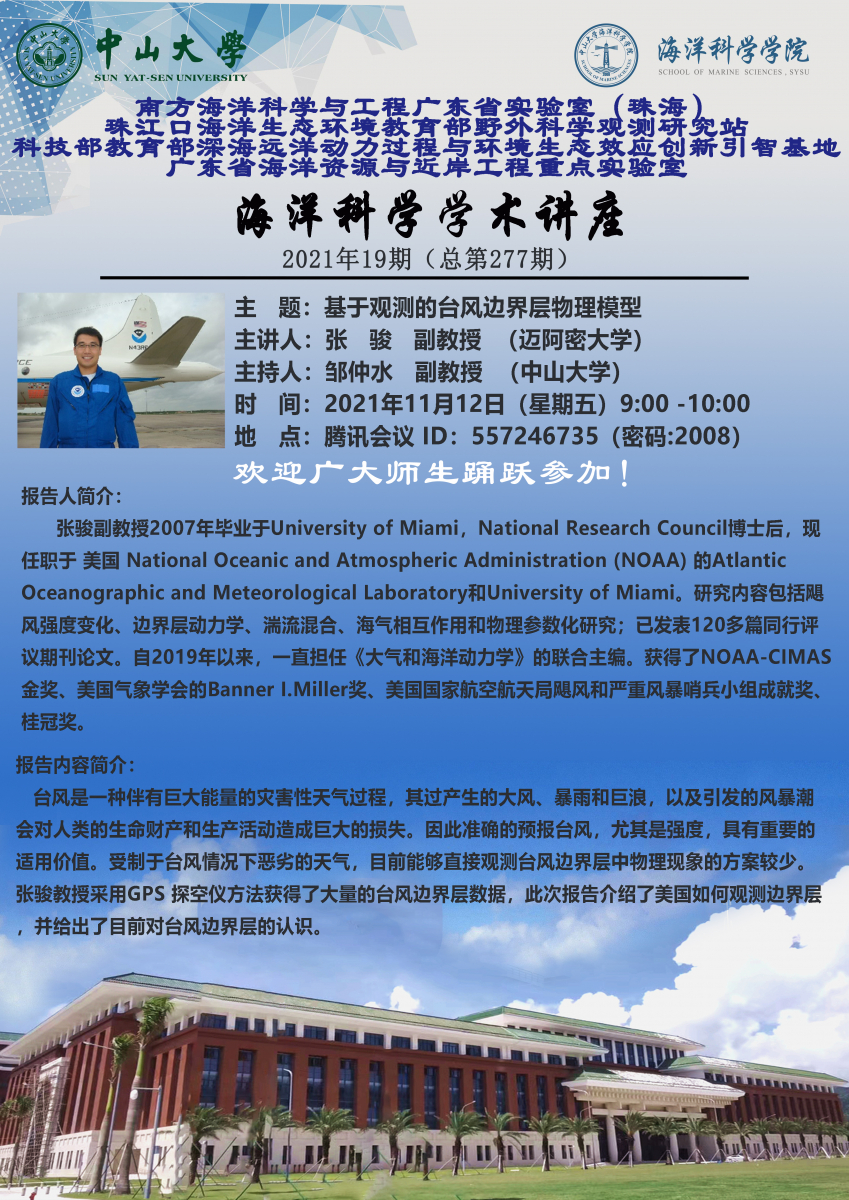 海洋科学学术讲座预告第277期:基于观测的台风边界层物理模型