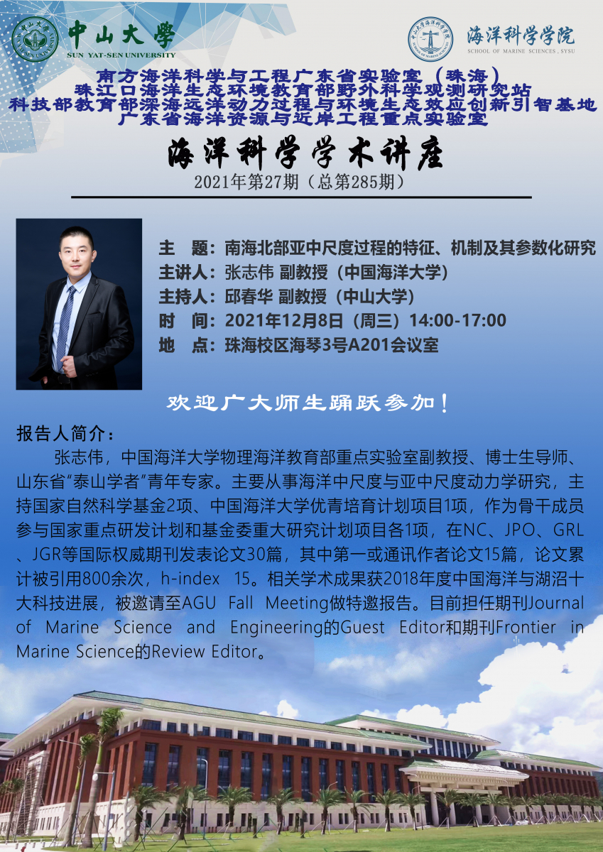 海洋科学学术讲座预告第285期:南海北部亚中尺度过程的特征、机制及其参数化研究