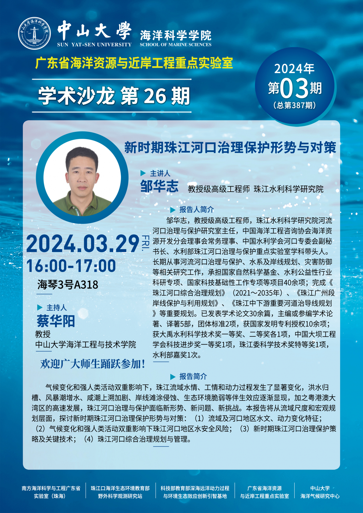 海洋科学学术讲座预告第387期:新时期珠江河口治理保护形势与对策